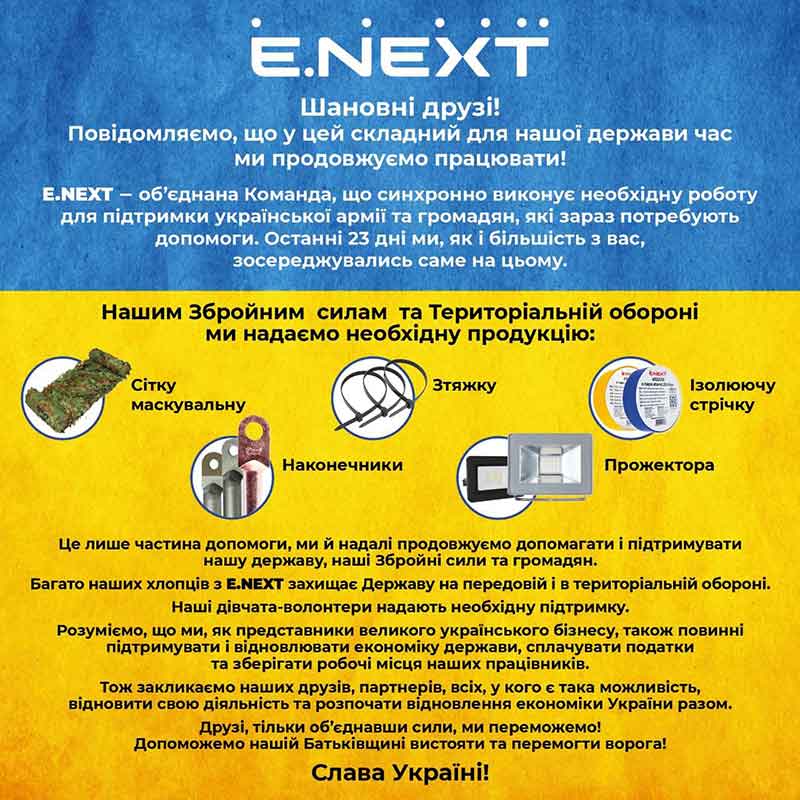 Це лише частина допомоги. Ми й надалі продовжуємо допомагати і підтримувати нашу державу, наші Збройні сили та громадян. Багато наших хлопців з E.NEXT захищає державу на передовій і в Територіальній обороні. Наші дівчата-волонтери надають необхідну підтримку.