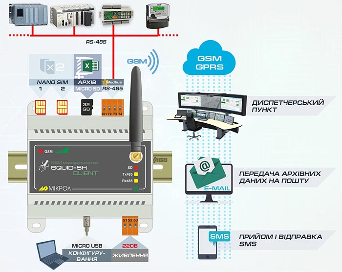 Для решения таких задач предприятие «Микрол» из Ивано-Франковска разработало GSM-контроллеры SQUID-5H. Новое поколение GSM-модемов SQUID-5Н-Client предназначено для систем промышленной автоматизации и диспетчеризации, которые обеспечивают беспроводной мониторинг, сигнализацию и управление любых территориально удаленных объектов.