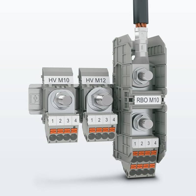 Для непосредственного отвода напряжения или отбора тока клеммы-отводы подключаются к общим шинам с помощью резьбовых винтов. Электромонтаж клемм-отводов выполняется без инструментов благодаря быстрому подключению с помощью технологии Push-in. Они доступны с поперечным сечением 10 мм². С внешней резьбой M10 и M12 можно реализовать до восьми точек соединения.