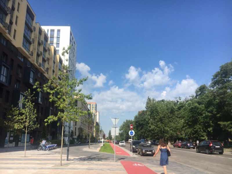 Протяженность обновленного участка улицы – всего 100 метров. На этой небольшой площади есть много интересного: зарядки для электромобилей, два пункта велопроката, умные скамейки с устройствами для подзарядки телефона, системы видеонаблюдения, фонтан и тревожная кнопка. А для людей с ограниченными возможностями обустроили пандусы и тактильную плитку.
